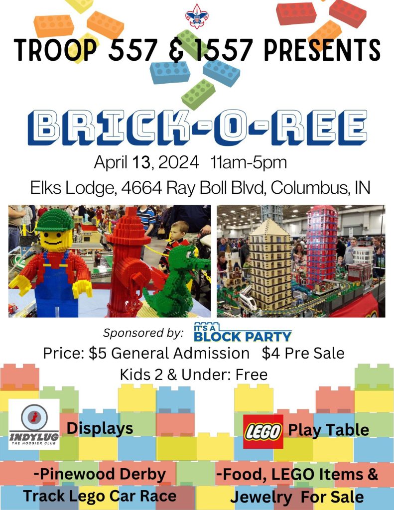 IndyLUG will be helping Boy Scout troops 557 and 1557 raise funds for a new trailer in Columbus in April. The show will be at the Elks Lodge at 4664 Ray Boll Blvd, Columbus, IN on Saturday, April 13 from 11:00 AM to 5:00 PM. Entry is $5 per person and kids 2 & under are free. IndyLUG members will be displaying a wide variety of LEGO creations. There will also be hands-on LEGO activities for the kids.